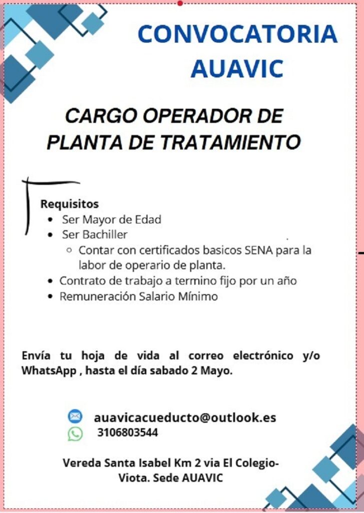 Convocatoria para la realización de algunos trabajos en la planta de tratamiento.